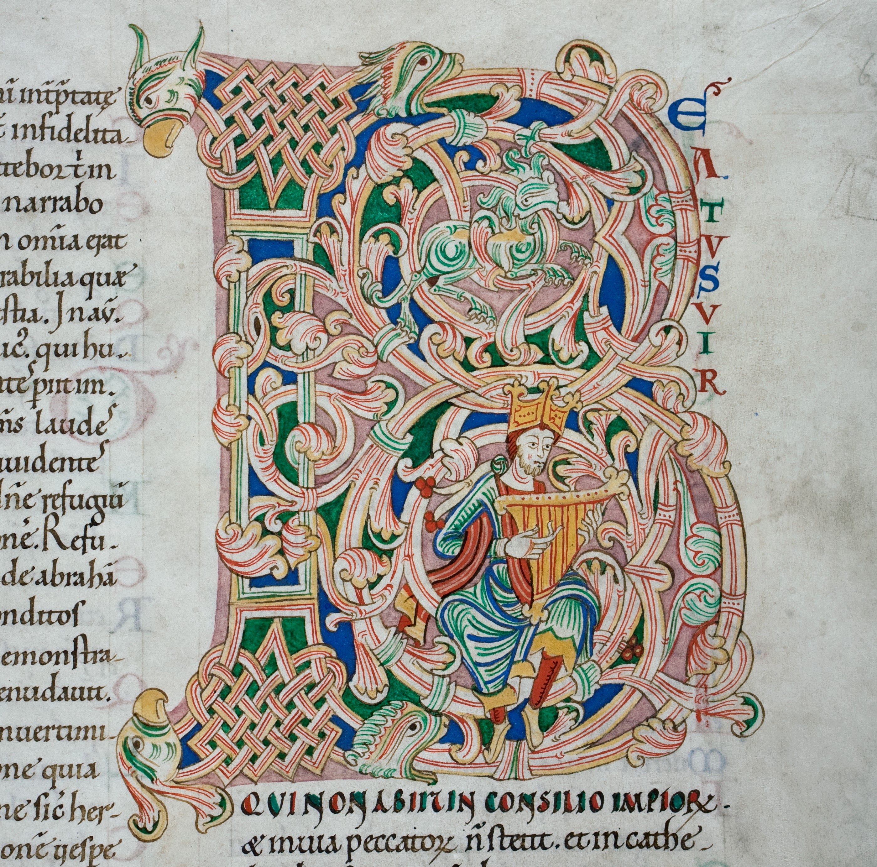This is a relatively simple illumination of King David as a harpist. This depiction closely corresponds to Anglo-Saxon carvings from this period. Note the similarity to the