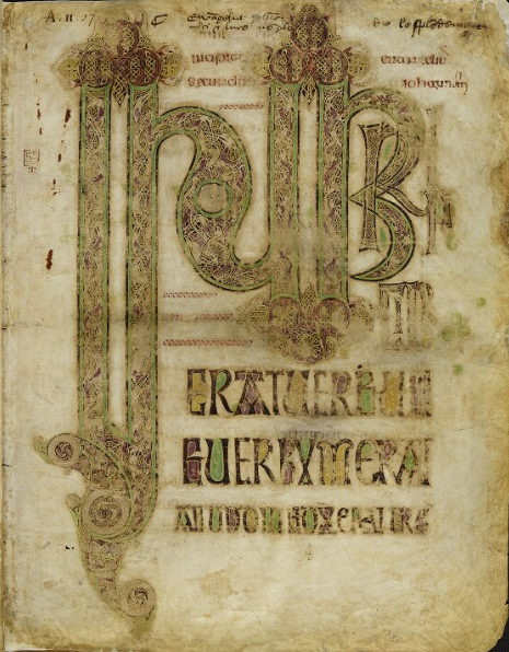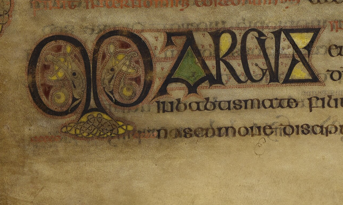 The Durham Gospels date to somewhere between the 7th and 8th century. This particular illumination display simple knotwork flourishes and only three colors!