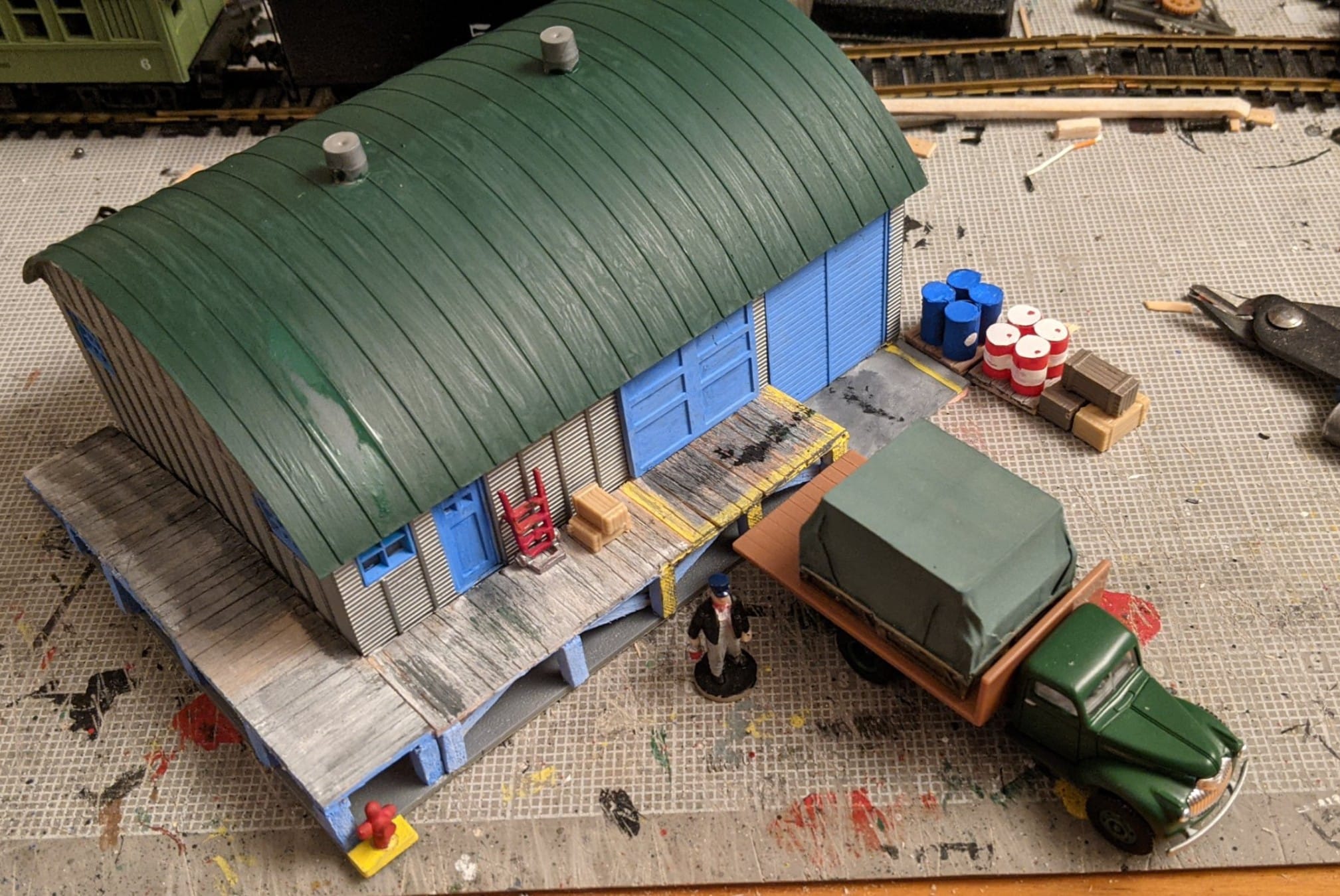 a wooden loading dock from coffee stirrers and matchsticks. The fire hydrant is just a bit of sprue from a set of Kadee coupler pockets.