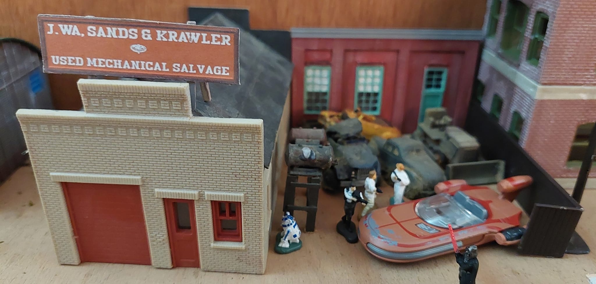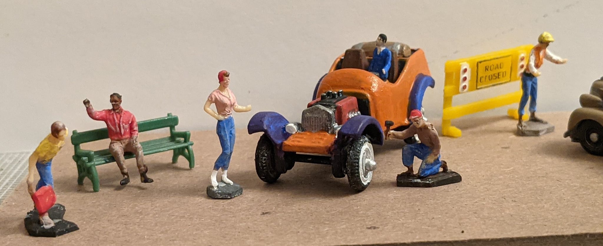 1:100 off brand figures that probably are normally sold to architects. An old Tootsietoy hot rod got a bit of a makeover.