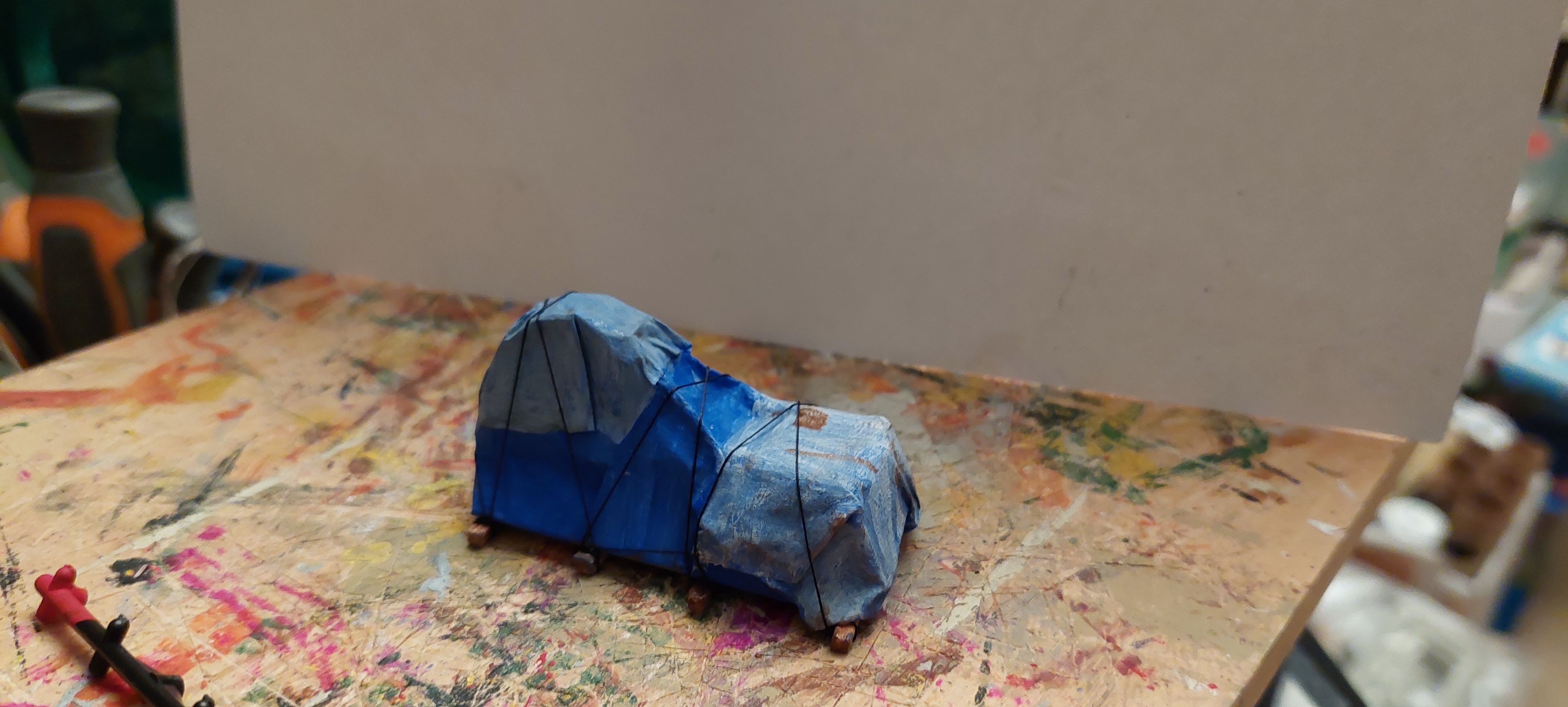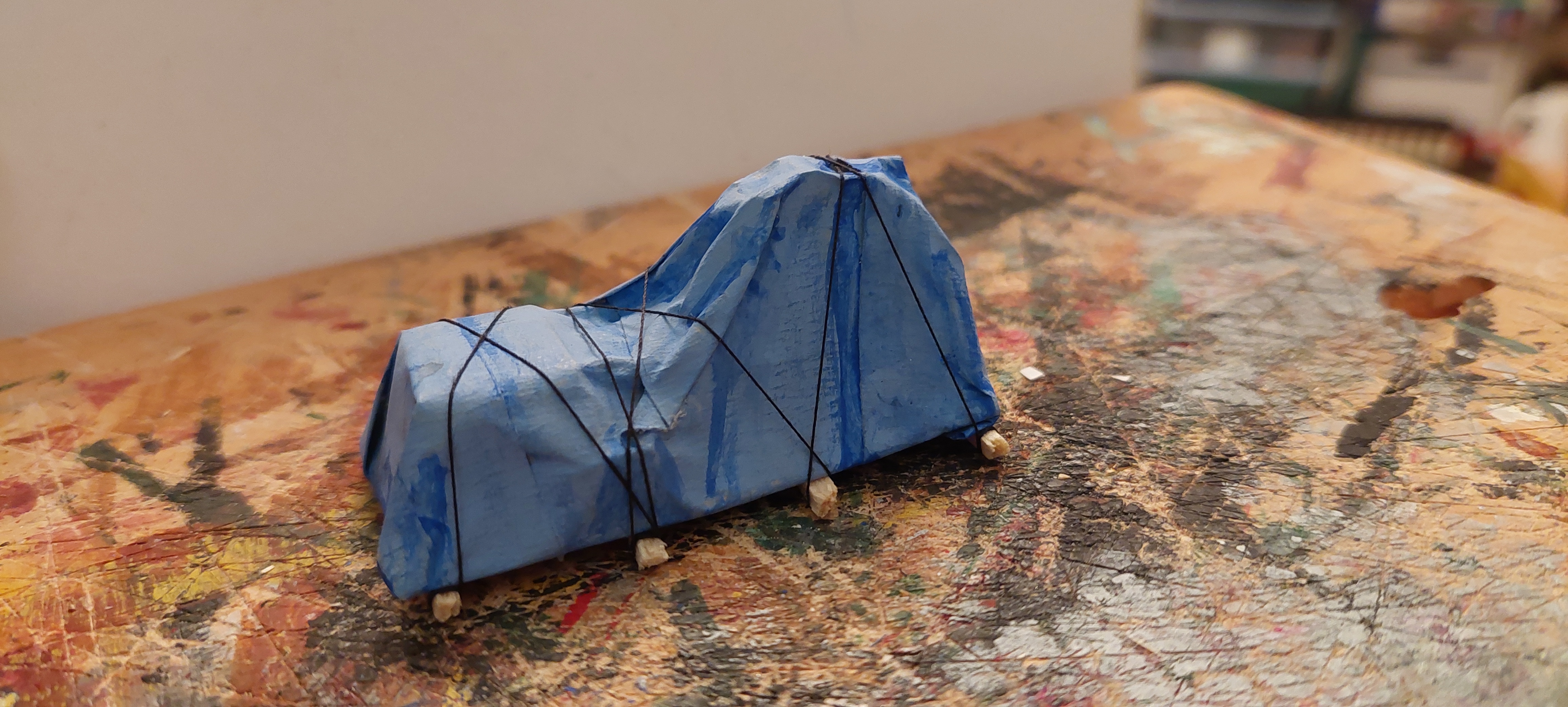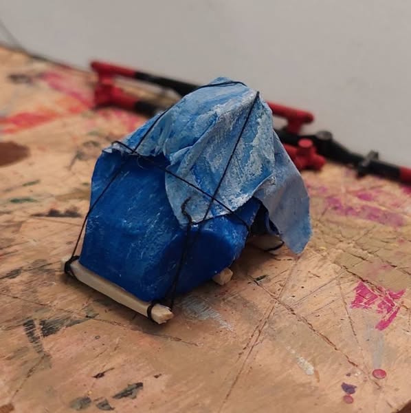 Once I draped and folded them over the load, I painted and weathered them, following up with black thread for the tie downs.