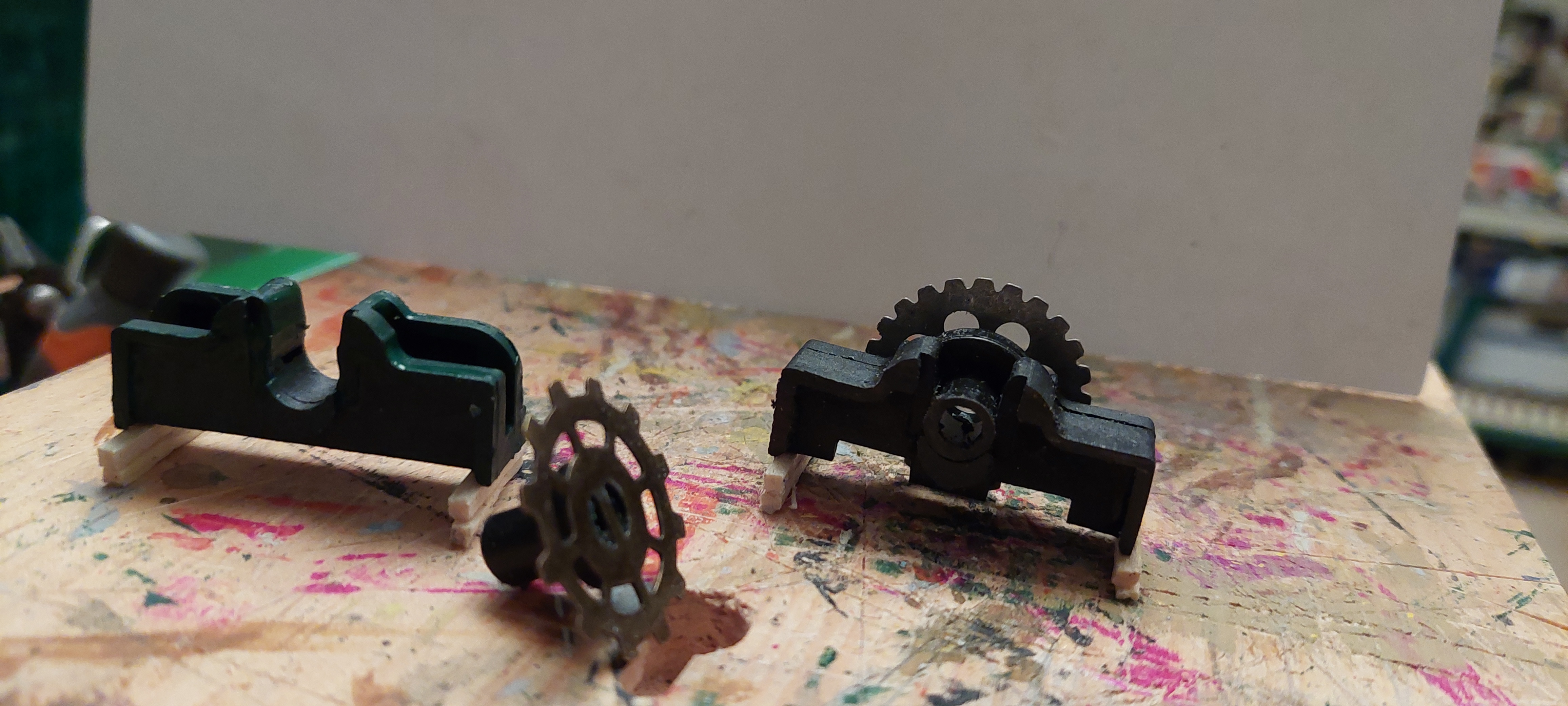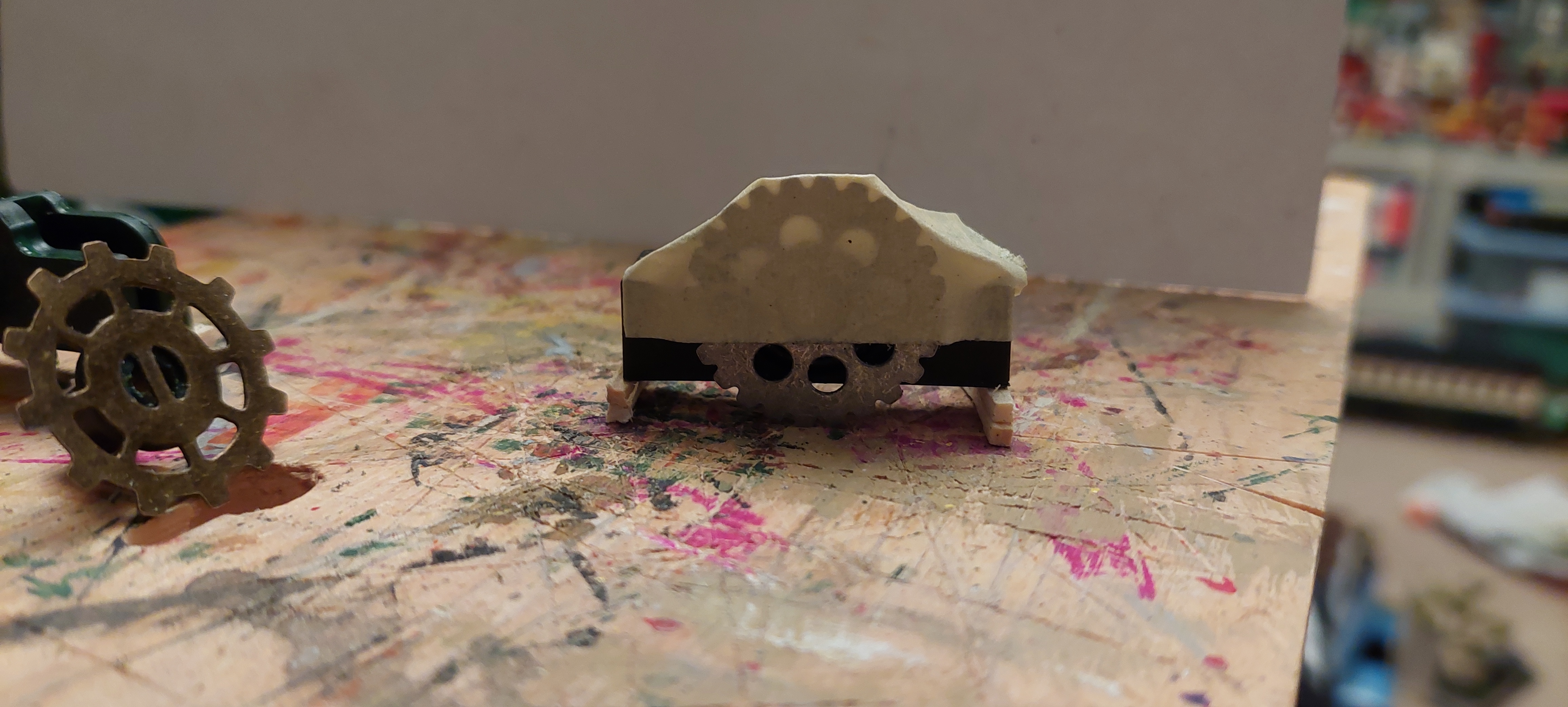 gears got glued to either side. Matchsticks form the sleepers. The "tarps" are all rectangles of wide masking tape that I cut into 10 scale feet strips.