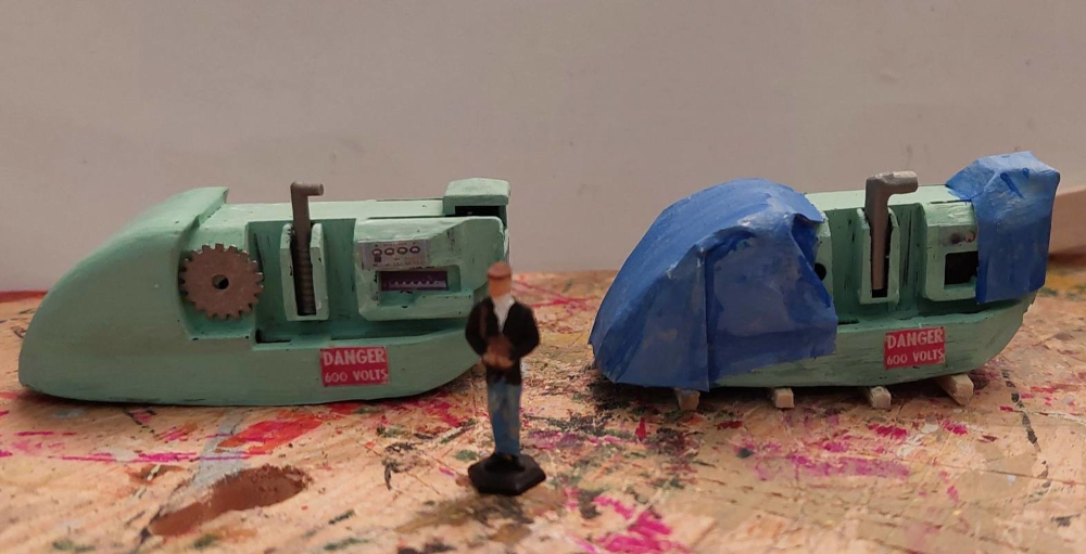 A bit of additional weathering and highlights for the tarps plus black thread for the tiedowns, and these two machines are ready for the layout.