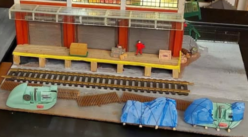 on a loading dock or inside a factory scene. Matchsticks were cut down to make sleepers