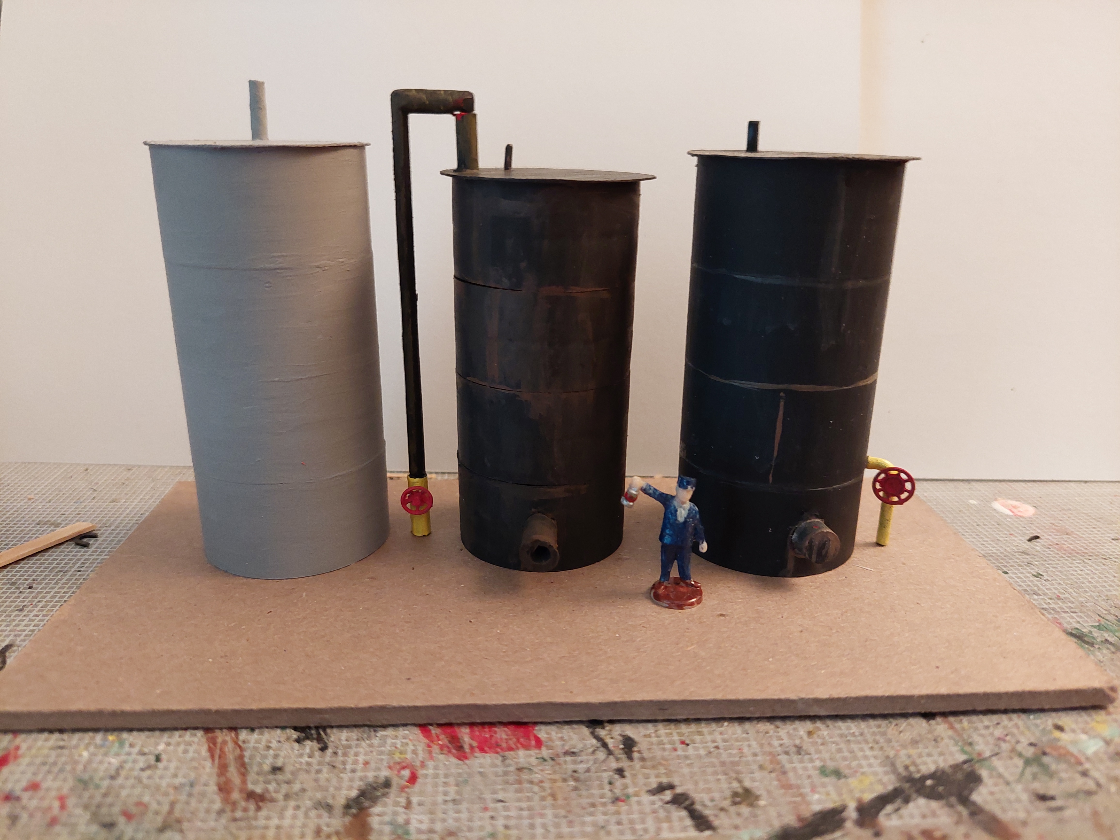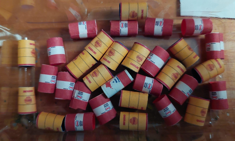 I have several plastic oil barrels accumulated as spares from kits over the years, but they are a bit annoying to paint, and labeling them with realistic brands and logos is a tedious exercise--especially if I need some in bulk for an oil dealer or a freight load. My method is quick, reasonably easy for HO scale, and is almost zero cost. | |||