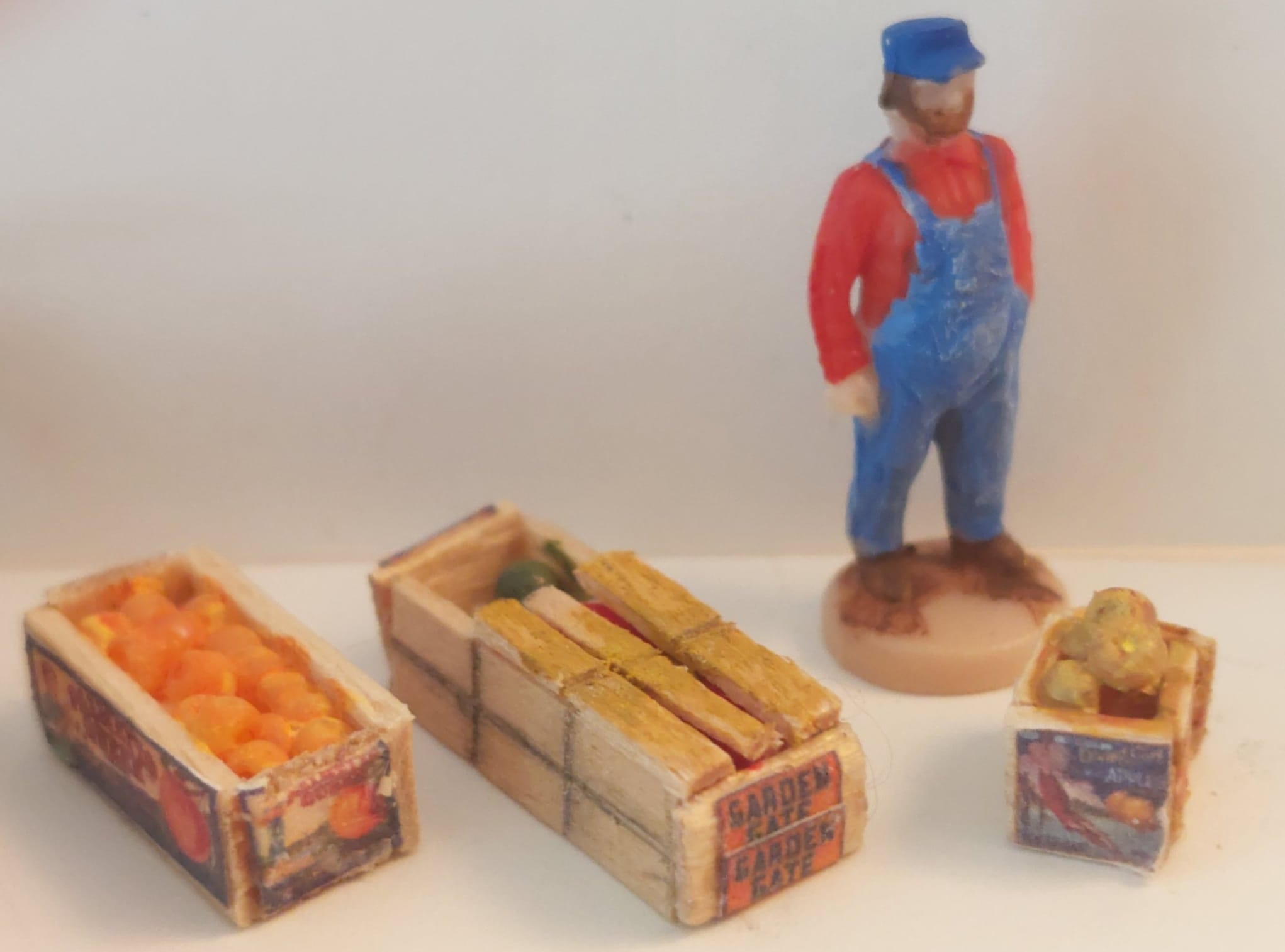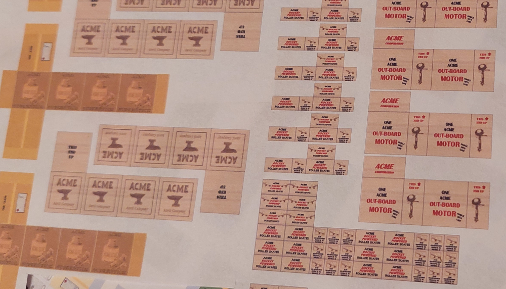 | After getting sticker shock at the prices of commercially available accessories, I started thinking a bit old school in terms of model railroading. People made things from wood, paper, and metal before plastic took over the industry. In fact, a lot of vintage toys and early railroad models were lithographed paper. For simple shapes like boxes and rectangular areas, a paper printout achieves the same effect. I scoured the Internet for inspiration and images, then with the magic of downloaded free fonts and PowerPoint, I created my own designs to suit my needs and sense of humor. Some simple box shapes are simply paper glued onto a piece of index card, others are glued to pieces of wood I shaped to the need. | |||