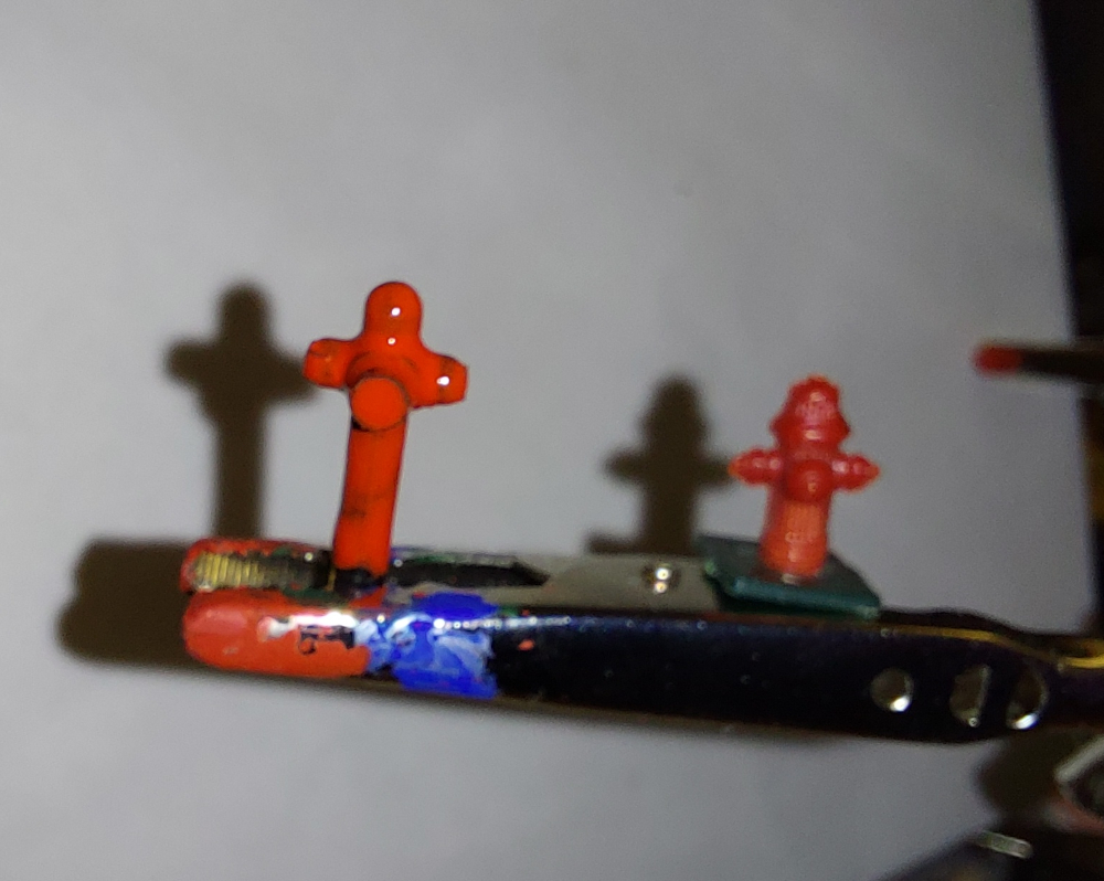 ![]() Kadee sprue becomes a hydrant Commercial hydrant from a scenery pack for comparison |