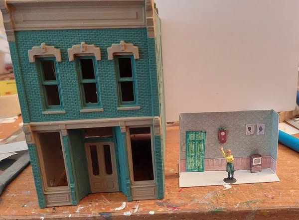 ![]() Shadowbox interior Not every building needs a full interior. A shadowbox hints at an apartment over the store. |